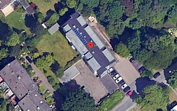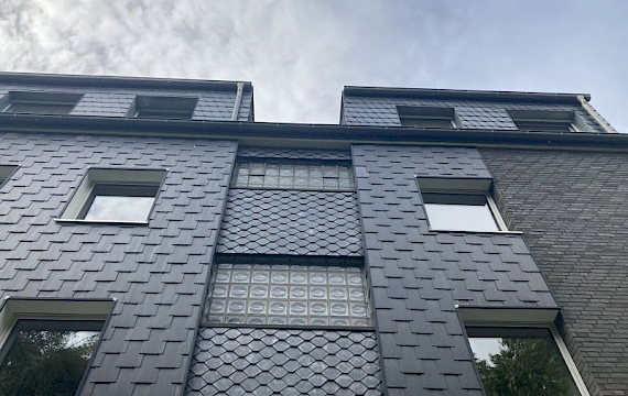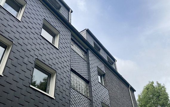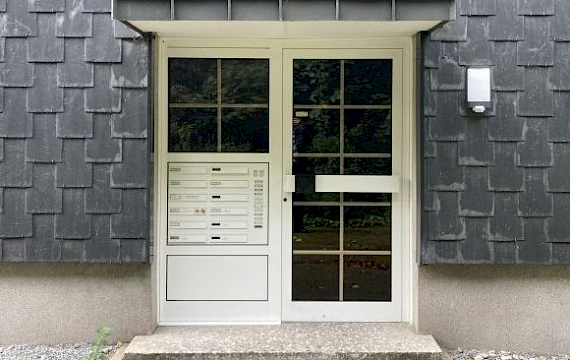 Fast ländlich an grünen Feldern liegt diese Bergische Schieferwohnanlage - mit Solarzellen zur Unterstützung der Heizung - an einem Park mit altem Baumbestand. Große Rasenflächen liegen vor den Balkonen.
